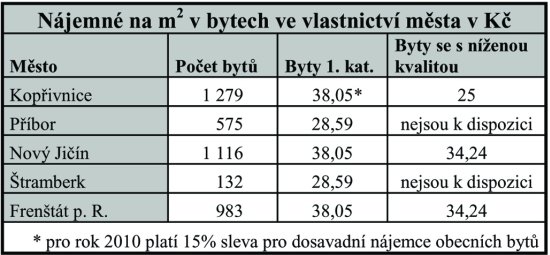 Na začátku března 2010 je nejvíce obecních bytů k dispozici v Kopřivnici, která vlastní 1 279 bytů. Těsně za ní je Nový Jičín s 1 116 byty a Frenštát pod Radhoštěm, který má 983 bytů. Ve všech těchto městech je nájemné v bytech první kategorie stanoveno na 38,05 Kč/m2. Byty se sníženou kvalitou jsou v Kopřivnici levnější. Zatímco v Novém Jičíně a Frenštátu pod Radhoštěm činí nájem za tuto kategorii 34,24 Kč/m2, v Kopřivnici jejich obyvatelé platí 25 Kč/m2. Kopřivničtí zastupitelé navíc vloni rozhodli o tom, že všichni dosavadní nájemci obecních bytů budou mít pro rok 2010 slevu 15 procent z ceny nájemného, místo 38 korun tak platí něco přes dvaatřicet korun za metr čtvereční. Ovšem ti, kteří se stali nájemci obecního bytu až v průběhu letošního roku, platí plnou cenu.