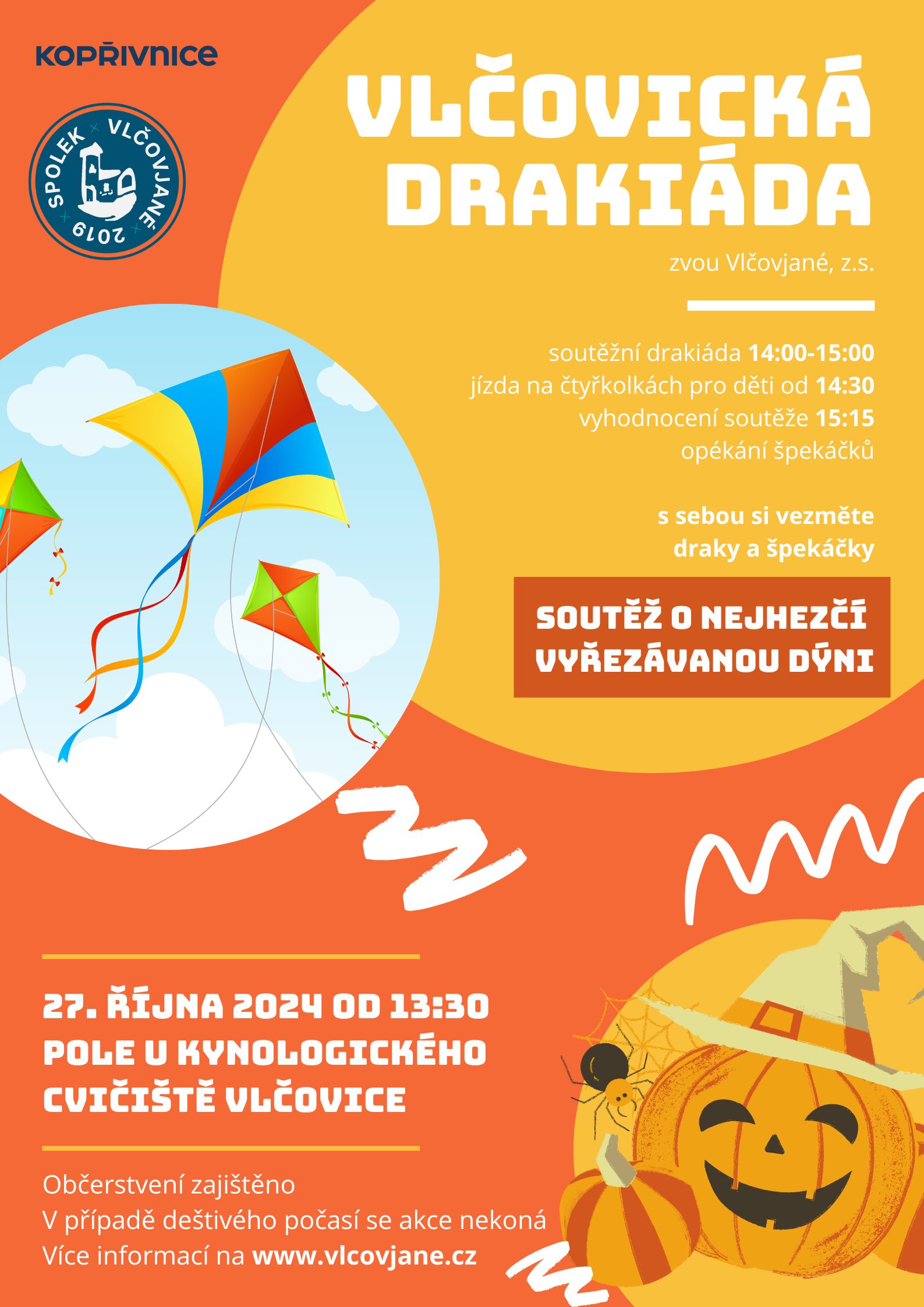 Další možnost příjemné rodinné aktivity v přírodě nabídne spolek Vlčovjané. Ten v neděli 27. října od 13:30 pořádá na poli u kynologického cvičiště Vlčovickou drakiádu. Kromě soutěže v pouštění draků budou součástí akce také jízdy na čtyřkolkách, možnost opékání přinesených špekáčků či soutěž o nejhezčí vyřezávanou dýni.