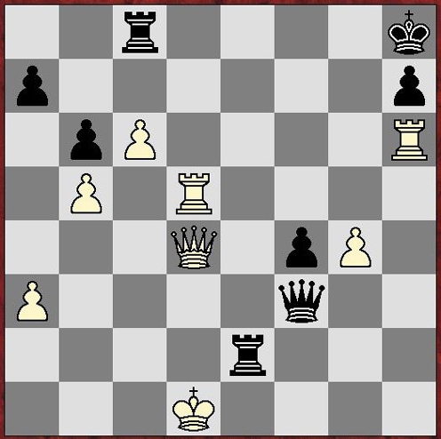1. e4 c5 2. c4 Jc6 3. Jc3 g6 4. g3 Sg7 5. Jge2 Jf6 6. Sg2 O-O 7. a3 d6 8. Vb1 Vb8 9. b4 Sg4 10. f3 Sd7 (rozehrála se jedna z nesčetných variant anglické hry)11. b5 Jd4 12. Jxd4 cxd4 13. Je2 Dc8 14. d3 Sh3 15. Kf2 Sxg2 16. Kxg2 (bílý udělal tzv. umělou rošádu) Jd7 17. Jf4 Jc5 18. h4 Dd7 19. h5 g5 (černý zřejmě nechtěl připustit otevření h-sloupce, avšak obavy nebyly zcela na místě, např. po e6, hxg6, fxg6 černému nic bezprostředně nehrozí.) 20. h6! (nepříjemný tah, po něm bílý stojí o něco lépe) gxf4 21. hxg7 Kxg7 22. Sxf4 (h-sloupec se bílému podařilo otevřít, k tomu i částečně g-sloupec - bílý stojí lépe)Vg8 ? 23. Sh6+ (1. zaváhání bílého po Vxh7, ztrácí černý minimálně pěšce, nelze brát věž pro mat 24.Dh1+ a 25.Dh6 mat) Kh8 24. Vh4 Vg6 25. Dg1 Vbg8 26. Vh3 e5 27. Dh2 f5 (pozice je opět v rovnováze, ale hodně dynamická, každý tah může změnit hodnocení) 28. Vh1 Jxd3 29. exf5 Dxf5 30. Sg5 V6g7 (oba útočí i brání současně, ale výhodu má černý) 31. g4 Df7 ?? (lépe Jxf4+) 32. Vh6 (2. zaváhaní bílého po Vxh7 nelze pokrýt mat po 32….,Vxh7 33. Sh6 !! a 34. Dxh7 mat) Je1+ 33. Kf2 Jd3+ 34. Ke2 Jf4+ 35. Sxf4 exf4 36. Kd3 Vc8 37. Vc1 d5 38. c5 Df8 39. Kxd4 Vgc7 40. Kd3 b6 41. Vh1 Df7 42. Db2+ Kg8 43. c6 Ve7 44. V1h5 Ve3+ 45. Kd2 De7 ?? (hrubá chyba) 46. Db4 ? (bílý nevyužil šanci obětovat 46.Vg6+ hxg6 a 47. Dh8+ s vítězným útokem) Ve2+ (jediný tah, který udržuje černého ve hře) 47. Kd1 De3 !! (obranný i útočný tah zároveň - bílý nemá v této otevřené pozici šach dámou a to je důležité) 48. Vg5+ Kh8 49. Vxd5 (bílý vypouští poslední šanci na výhru po Vxh7+ a Db1+ s nekrytelným matem v několika tazích) Dxf3 !! (vítězný tah, hrozí mat na f1, nebo nepříjemné odtažné šachy s Ve2) 50. Dd4+ (Tento šach přichází pozdě, neboť po) Ve5+ ( přichází rovněž šach, který lze lehce přehlédnout, po kterém ztrácí bílý věž a může se vzdát) 51. Kc1 Dxd5 52. Dxf4 Dc5+ 53. Kb2 Dxb5+ 54. Kc3 Vxc6+ 55. Vxc6 Dxc6+ 56. Kb2 Vb5+ 57. Ka1 Dc3+ a bílý vzdal, protože dostane Db2 mat. 0:1 Velmi napínavá a na matové kombinace zajímavá partie. (Pavel Káňa)